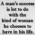 A man’s success is lot to do with the kind of woman he chooses to have in his life. The best collection of quotes and sayings for ever...